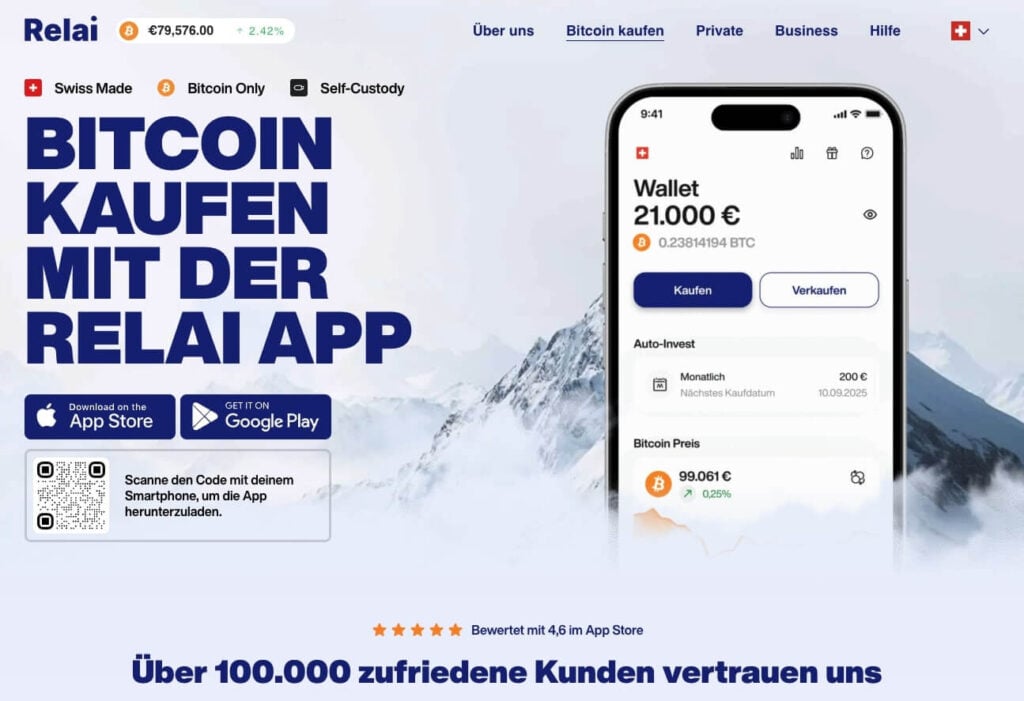 Für vermögende Anleger bietet Relai Private einen OTC-Service für Käufe ab 100.000 EUR, während Relai Business kleinen und mittelständischen Unternehmen hilft, Bitcoin in ihre Unternehmenskasse aufzunehmen. Die Plattform ist einfach zu bedienen und richtet sich besonders an Einsteiger, die Bitcoin kaufen und langfristig halten möchten.