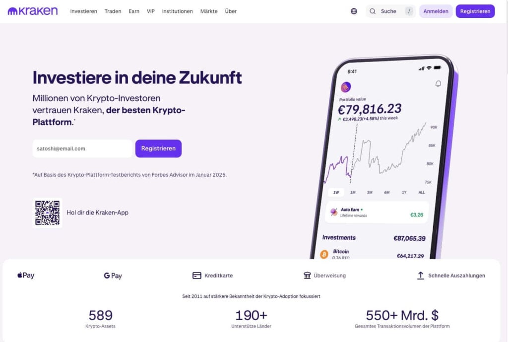 5. Kraken – Langgediente Krypto-Börse mit niedrigen Gebühren